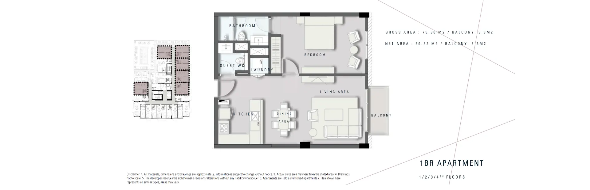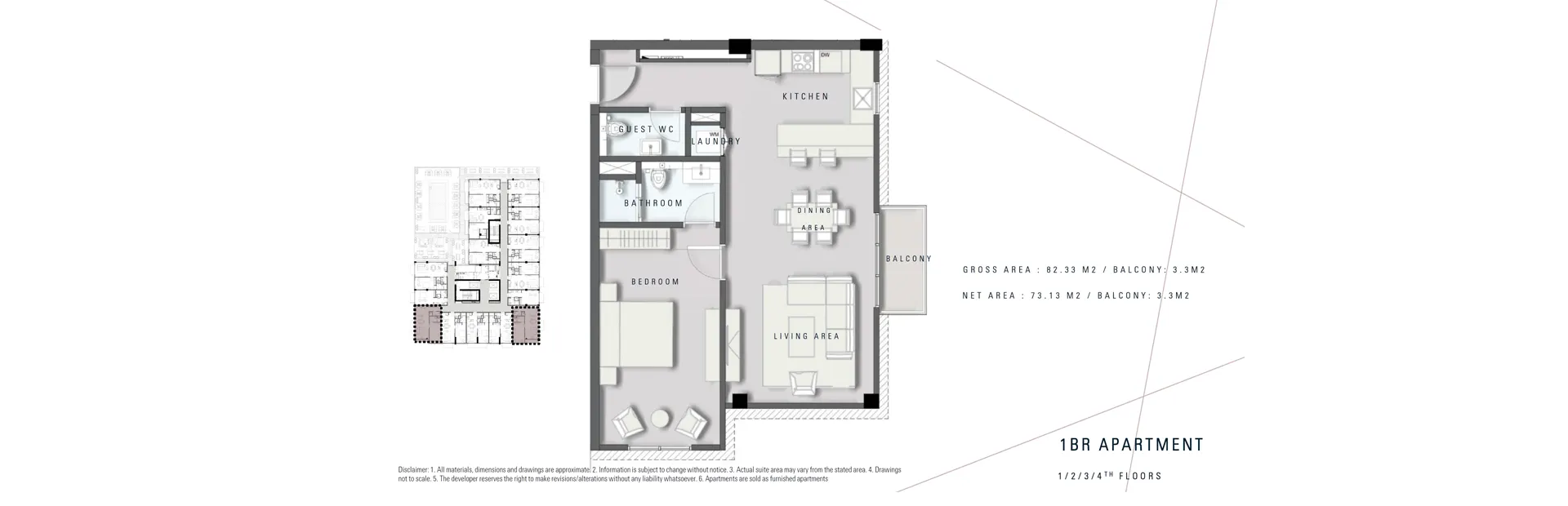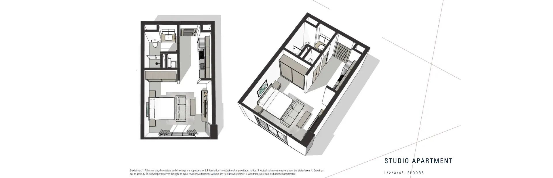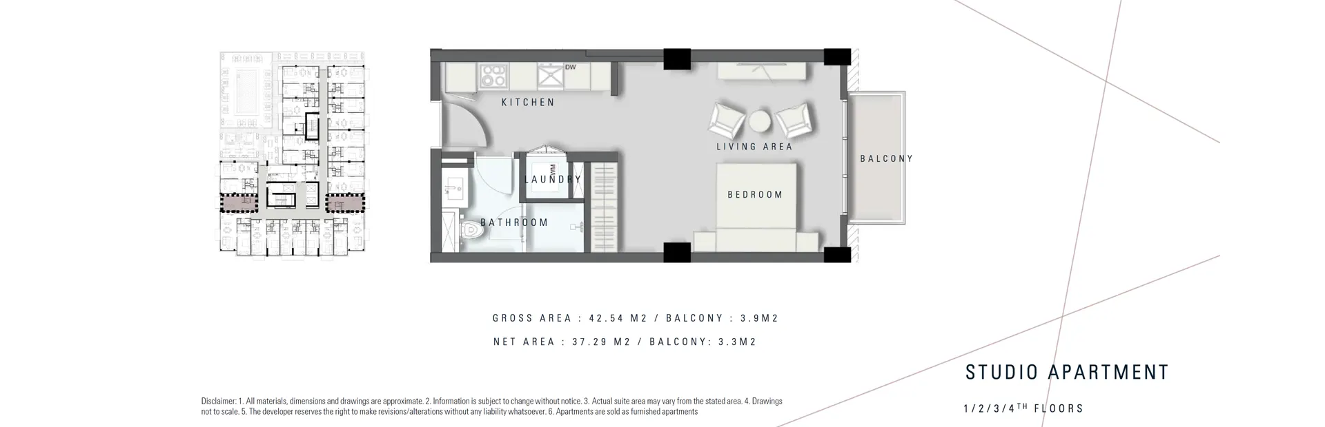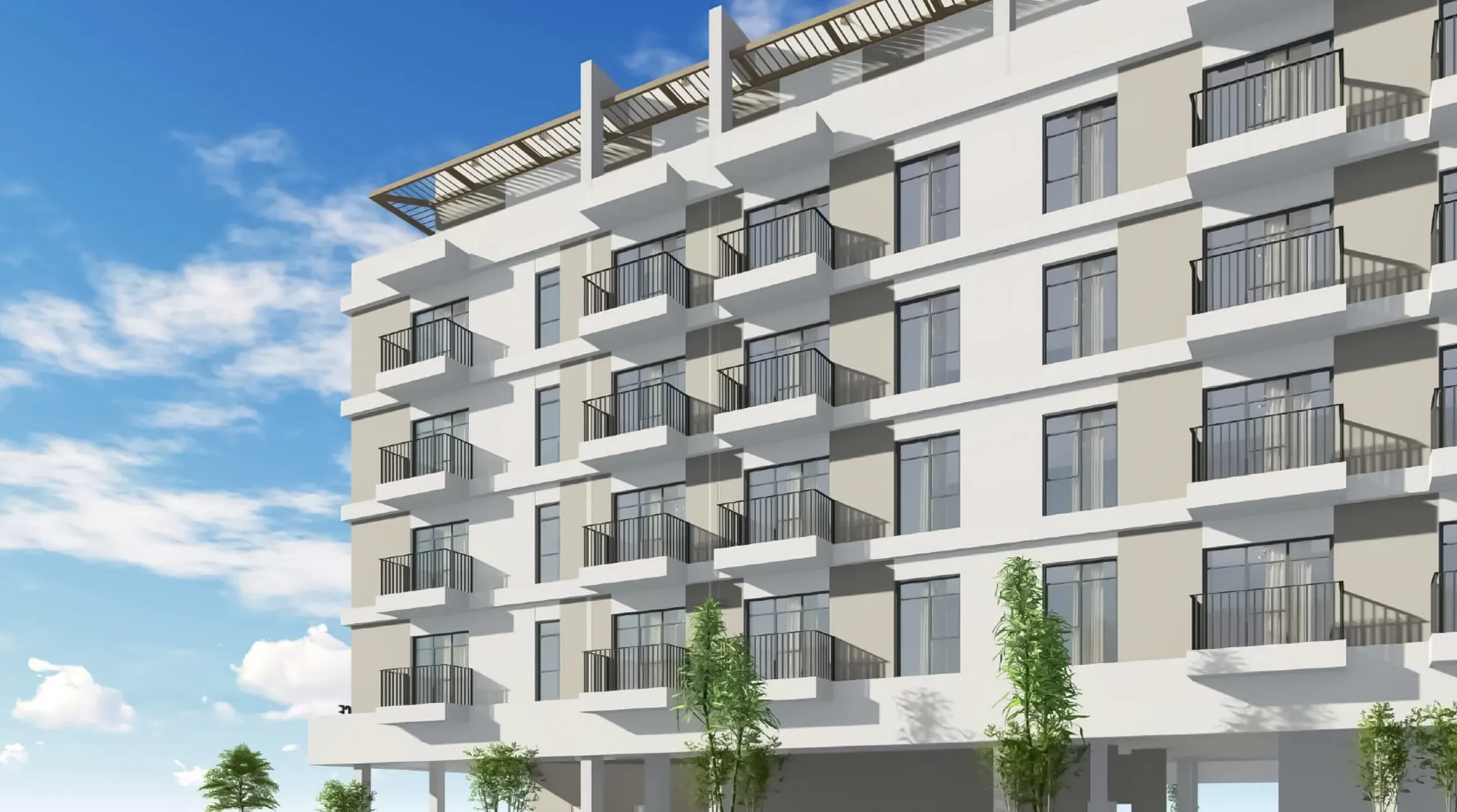 A selection of studio and one-bedroom apartments is available within the residence. The building contains a total of 16 studio units and 59 one-bedroom units. The distribution of apartments is consistent from the first to the fourth floors, with each level containing two studios and thirteen one-bedroom flats. The fifth floor has a different configuration, offering eight studio and seven one-bedroom apartments. All apartments are sold as fully furnished residences.