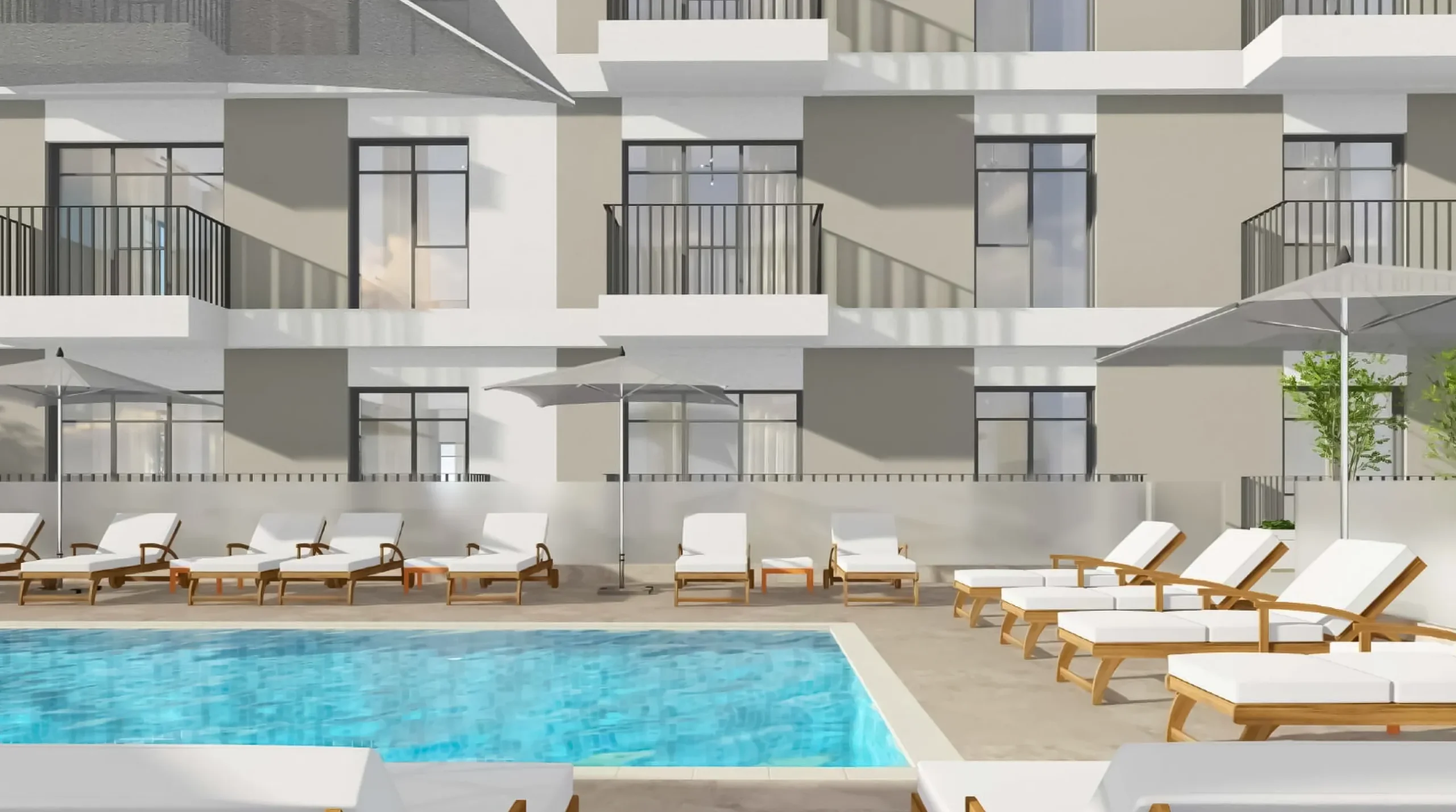 A large outdoor swimming pool with an adjacent seating area.